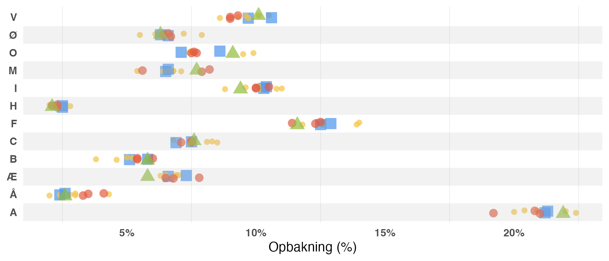 I nedenstående figur viser, hvordan alle estimater fordeler sig for de forskellige partier, så vi kan se hvordan enkeltmålinger (●), exitpolls (●) og vægtede snit (■) klarede sig i forhold til valgresultatet (▲). Jo længere et estimat ligger fra valgresultatet, desto dårligere klarede den pågældende meningsmåling, exitpoll eller snit sig.