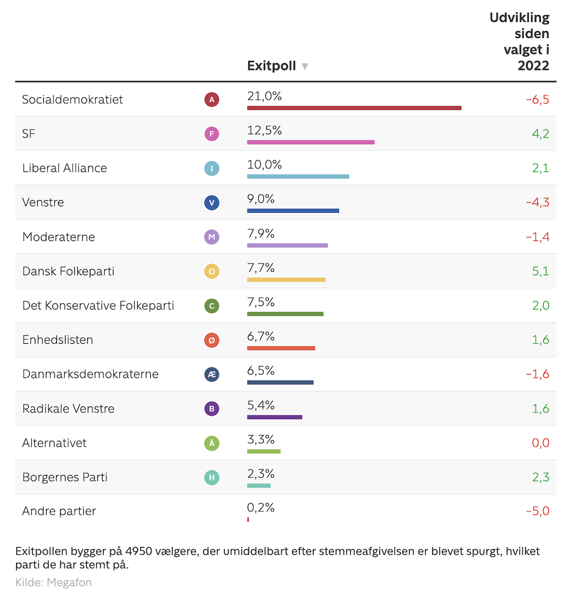 En sjov iagttagelse er, at Megafons første exitpoll klarede sig bedre end deres opdaterede exitpoll. Det er en gentagelse af folketingsvalget i 2022, hvor deres første exitpoll også klarede sig bedre end deres opdaterede exitpoll. Min opfordring til TV 2 og Megafon vil være at offentliggøre én exitpoll på valgaftenen, og det virker til, at alt hvad de gør med deres exitpolls efter klokken 20 på valgaftenen ikke er for det bedre.